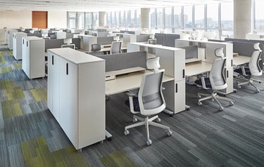The Around Chair is understated design and lines that comfortably support a sitting posture stand out . The comfortable mesh backrest and the combination of various colored seats create a lively space .