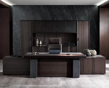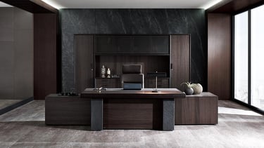 CEOS combines the finest natural wood grain with a sophisticated design. The leather-wrapped tabletop and voluminous side panels complement each other, creating a sophisticated and sophisticated atmosphere in any space.