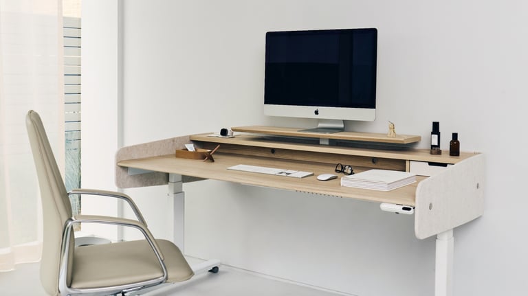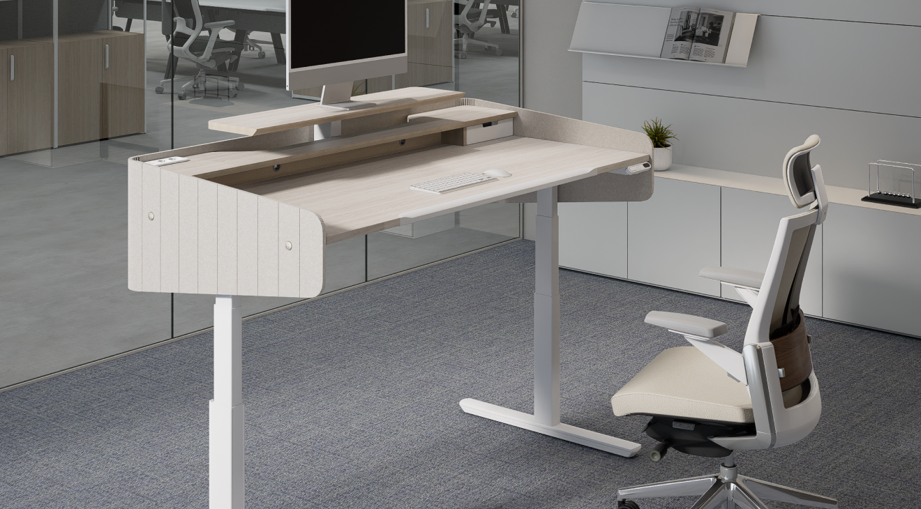 This innovative motion desk not only provides basic desk height adjustment functions, but also allows for fine adjustment of the height of the monitor shelf.